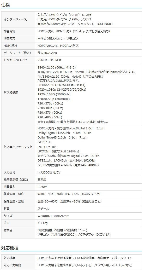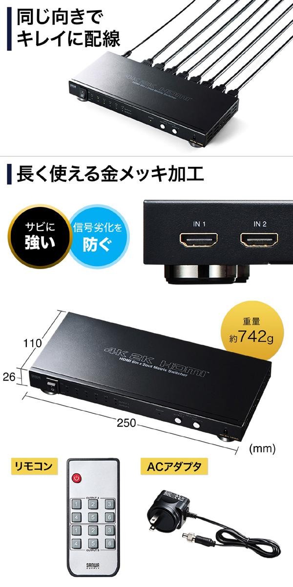 fk094igrjsHDMI機器6台の映像・音声を切り替えて、2台のテレビやプロジェクターなどにマトリックス切り替え分配出力できるHDMI切替器です サイズ 個装サイズ:6×30×24cm 重量 個装重量:1070g 生産国 中国 6入力・2出力のHDMIマトリックス切替器 HDMI機器6台の映像・音声を切り替えて、2台のテレビやプロジェクターなどにマトリックス切り替え分配出力できるHDMI切替器です