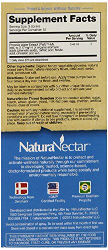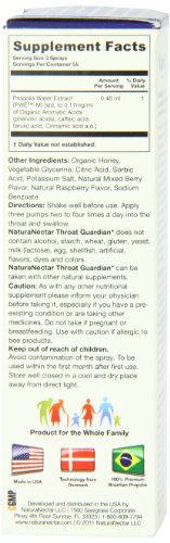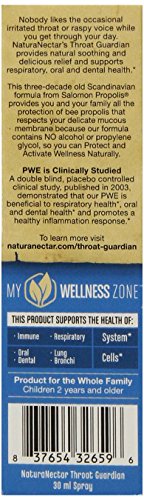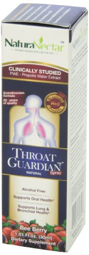 -. Binding : Health and Beauty -. Brand : NaturaNectar -. EAN : 0837654326596 -. Feature : Based on Original 3-Decade-old Formula from Scandinavian Salomon Propolis / Effectively Support Lung and Bronchial Health / Promote a Healthy Inflammation Response / Well Tolerated with no Adverse Effects. / Gently Supports Oral Health not Damaging the Mucous Membrane -. IsAdultProduct : 0 -. Label : NaturaNectar -. LegalDisclaimer : Actual product packaging and materials may contain more and different information than what is shown on our website. We recommend that you do not rely solely on the information presented and that you always read labels, warnings, and directions before using or consuming a product. Please see our full disclaimer below. -. Manufacturer : NaturaNectar -. Model : 32659 -. MPN : 32659 -. NumberOfItems : 1 -. PackageQuantity : 1 -. PartNumber : 32659 -. ProductGroup : Health and Beauty -. ProductTypeName : HEALTH_PERSONAL_CARE -. PublicationDate : 2013-09-03 -. Publisher : NaturaNectar -. ReleaseDate : 2012-02-01 -. Size : 1.01 oz -. Studio : NaturaNectar -. Title : NaturaNectar Throat Guardian - Bee Berry - 30 ml - Spray -. UPC : 837654326596