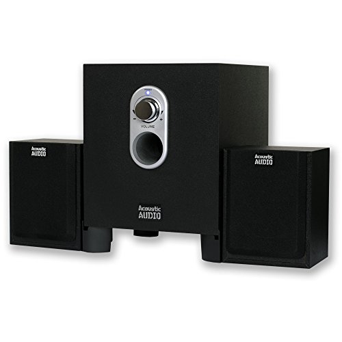 This Acoustic Audio 2.1 Speaker System features a contemporary design and is a stylish addition to any home. This 250 watt, 3-piece system includes one (150W) powered subwoofer and two (50W) satellite speakers as well as all the necessary cables and instructions needed to "Plug and Play" any audio source. Use it for your home theater stereo system, personal computer or laptop, DVD player, TV, gaming system, "i" device, MP3 player, or other devices with a 3.5mm or RCA audio output (3.5mm to RCA cable included). The powered subwoofer features down-firing woofer and utilizes a digitally tuned wooden enclosure for increased bass response. You can control power, volume and bass functions directly from the subwoofer. The full-range satellite speakers feature magnetic shielding for use near televisions and computer monitors.Feature