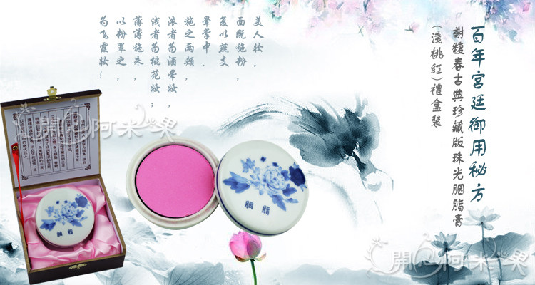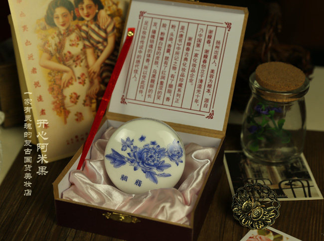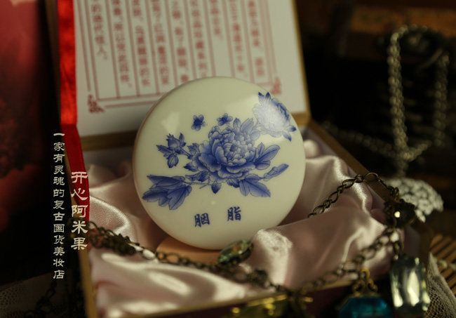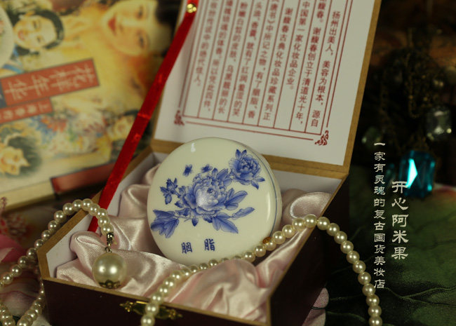 | 产品介绍: | 本品用景德镇手绘牡丹花青花瓷盒装,寓意:娇美高雅!美颜如花!瓷盒的底部写有“谢馥春道光十年”的字样,圆盒直径6.7厘米,外包装盒为玫瑰紫木盒,内外包装,古色古香令人爱不释手!尽显国粹风范! 包装特点:采用景德镇瓷器完全复制古代胭脂盒,本身就是一件艺术品。 小知识:胭脂亦作燕支,因产于燕地而得名。《妆台论》有“美人妆,面既施粉,复以燕支晕掌中,施之两颊,浓者为酒晕妆,浅者为桃花妆;薄薄施朱,以粉罩之,为飞霞妆”之说。 | |||