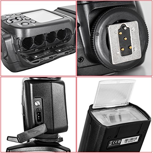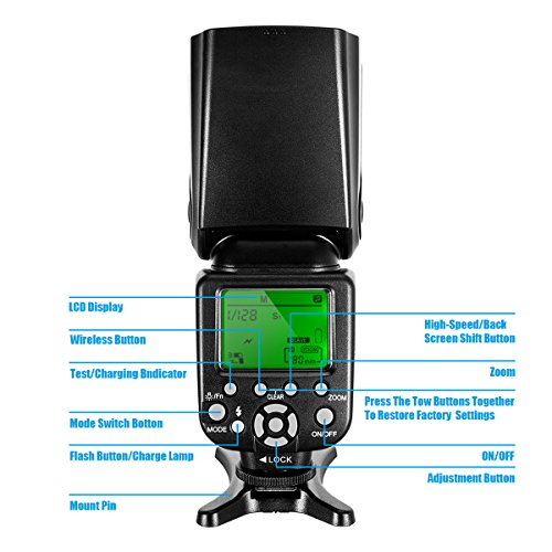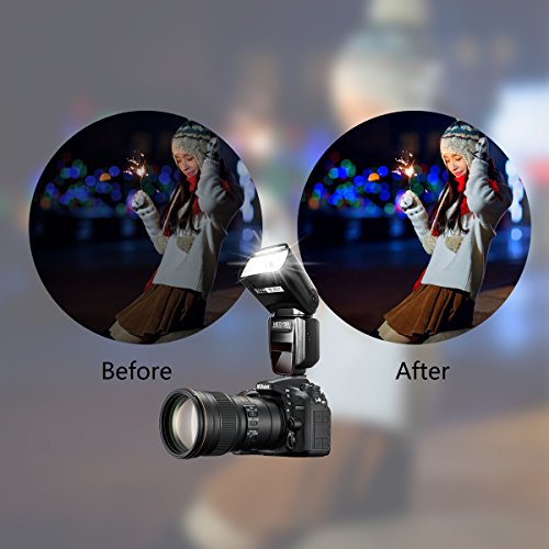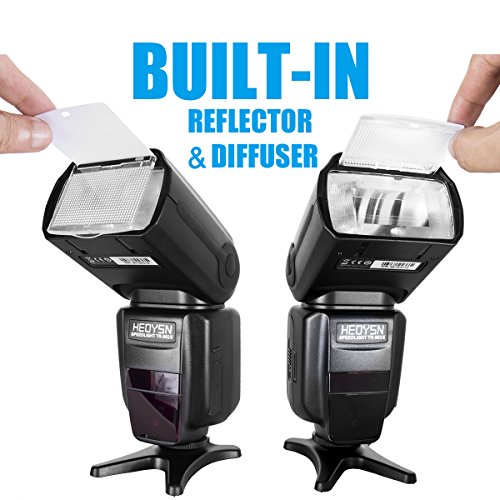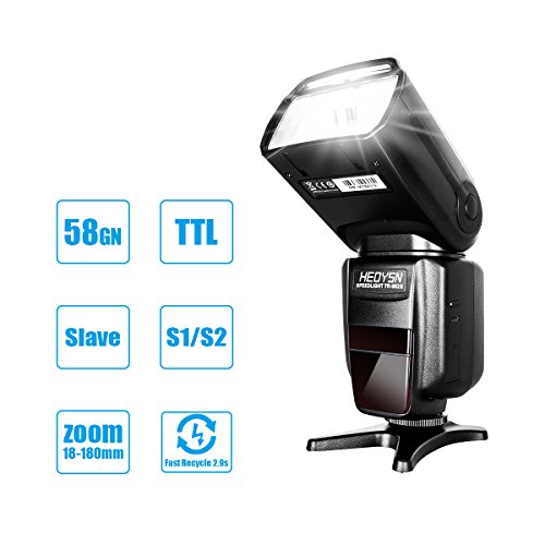 Heoysn I-TTL HSS Speedlite Flash for Nikon DSLR Cameras It's an easy-to-use I-TTL Flash with LCD display for all Nikon Cameras with professional features and outstanding build quality, especial with an affordable price. It's a reliable and powerful flash which is helpful for photographers of all levels. Includes rear-curtain sync, motorized zoom head, AF Illuminator, built-in optical wireless slave modes, and fast recycle time. One step to break away from dull built-in flash into the whole new magic world of photography. Specifications Guide Number: 58 (ISO 100, 105mm) Flash Mode: M, MULTI, S1, S2 Flash Coverage: 18~180mm Vertical Rotation Angle :-7~90 degrees Horizontal Rotation Angle: 0~270 degrees Power: 4 x AA size Ni-MH batteries or Alkaline Batteries Flash Time: 1/200s~1/20000s Lighting Times:100~1500 times Flash Control: 1/128~1/1 step length 0.3EV, total 22 fine-tuning stalls Color Temperature: 5600K±100K Flash Duration: 1/300s~1/20000s Dimensions: 190 x 75x 55mm Net Weight: 286g Package Contents 1 x Heoysn I-TTL Speedlite Flash 1 x Micro Flash Stand 1 x Carrying Bag 1 x User Manual 0 |