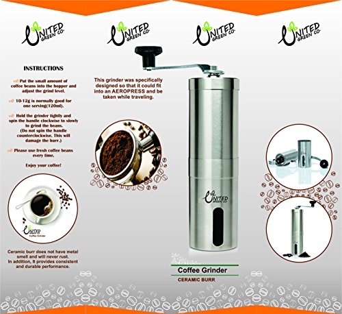 -. Feature : ==> PRECISION GRIND This coffee grinder has been crafted with excellence and precision. Grinds with ease, with no sticking.Regardless if you are grinding for french press or aeropress, the ceramic conical burr helps to grind the coffee beans in a uniform size. Unlike blade grinders, this manual conical burr grinder will provide you with much more control over your grind / ==> ADJUSTABLE No need to unscrew the entire grinder in order to adjust the grind size. Simply turn the knob clockwise or counterclockwise in order to reach perfect size for any coffee drink such as espresso, drip, french press, cold drip, etc / ==>>RUST & DAMAGE FREE: This coffee mill is made of high grade stainless steel which gives it a modern look, but most importantly increases its durability. Due to the ceramic conical burr, and the sleek stainless steel finish, there is no need to worry about damaging rust. / ==>STAINLESS STEEL BODY & LIFETIME WARRANTY; Manufactured from high quality corrosion resistant stainless, the grinder is designed to be easy to use, easy to clean, durable and lightweight / ==>PORTABLE: The United Green Co Travel Manual Coffee Grinder was specifically designed to fit into an aeropress making it easy to take with you while hiking, camping or on vacation. This coffee grinder is so compact it will take up minimal space in your backpack. DESIGNED FOR AEROPRESS: This grinder was specifically designed so that it could fit into an AEROPRESS and be taken while traveling. We designed this grinder with the minimalist in mind butwithout sacrificing quality. The coffee mill is made of high grade stainless steel which increase its durability.Small enough to slip into a day pack