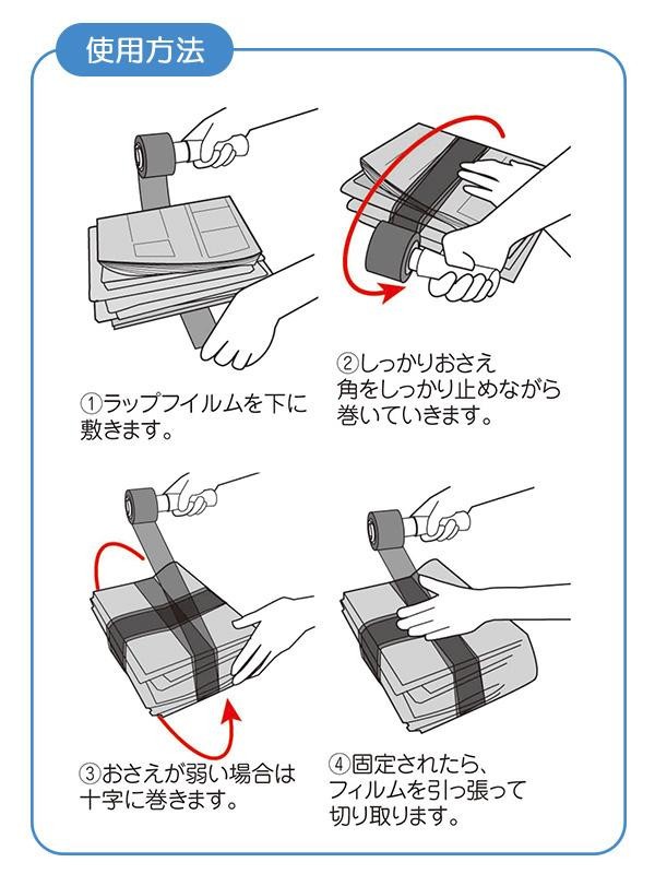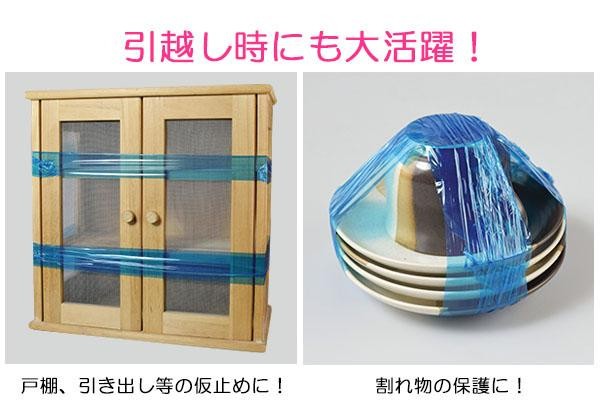 | 資源ゴミや不燃ごみ等の結束に便利なラップフィルム。不要になった蛍光灯、傘、カーペット、ダンボール等にスルッと巻いて一発結束!!戸棚・引き出しの仮止めや、割れ物の保護にも使えるので引っ越し時にも大活躍。 |