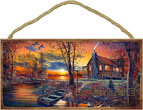 (SJT21533) Life is better at the Lake (cabin with boat) 5" x 10" wood plaque, sign - Features the artwork of JQ Licensing