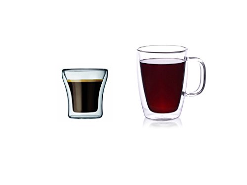 -. Feature : ~VALUE BUNDLE: Two great products in one set! Pair of double walled Coffee Mugs & Espresso Glasses / ~DOUBLE WALL GLASS: Insulated double-wall design keeps your cold drinks cold, with no condensation or sweating. / ~HIGH-QUALITY: Made of heat and shatter resistant borosilicate glass, which is stronger and more durable than common glass. / ~DURABLE: Completely dishwasher, microwave and freezer safe / ~PERFECT GIFT SET: This set would be a great gift to newlyweds, two of each glass, perfect for sharing! Purchase two bundles for a 4-place setting!