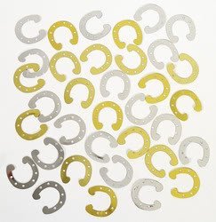 -. Feature : One bag of confetti / Two ounce bag of confetti / Assorted silver and gold horse shoes / Each horse shoe is approximately 3/4 ″ long and wide / One ounce will lightly cover an 84″ long x 54″ wide tablecover