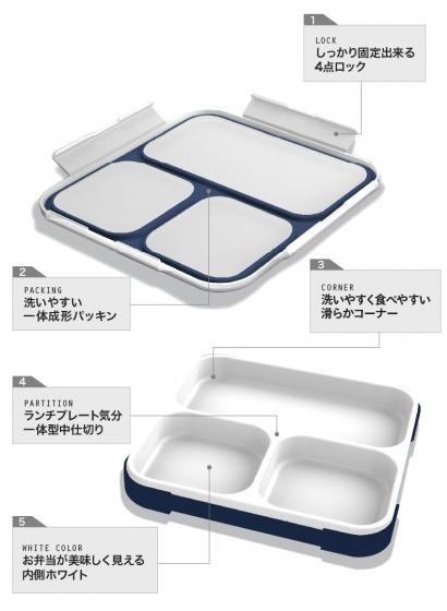 | A4サイズ幅で厚さ35mmの薄型弁当箱。通勤通学時の持ち運びがスマートに!!しっかり固定の4点ロックで汁漏れの心配もありません。ランチプレートの雰囲気で食べられて、容量も800mlとたっぷり入ります!! |