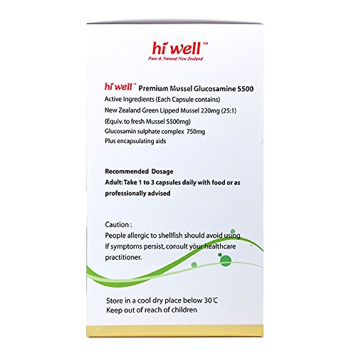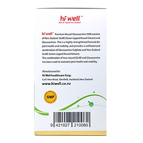 Here is the Hi Well Mussel Glucosamin from New Zealand. Hi Well Premium Mussel Glucosamine 5500 consists of New Zealand GLME (Green Lipped Mussel Extract) and Glucosamine. This is a highly strengthened formula for joint health and mobility, and provides a well balanced combination of Glucosamine Sulphate and New Zealand GLME. The combination of two natural GLME and Glucosamine has been used to maintain joint health and mobility.Feature