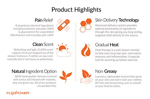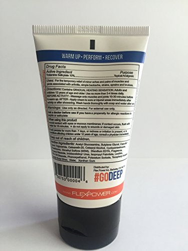 -. Feature : Our original and most popular formula provides warm, penetrating relief and contains a proP.R.Ietary blend of MSM, Lecithin, Aloe, Glucosamine, tissue nutrients as well as other ingredients. The ingredients your new tube of FlexPower act in orchestrated synergy to produce a combined pain-relieving sensation that is greater and longer-lasting than what each of them could do on their own. / Intensive Concentration Going Deeper Into the Muscles-Closer to the Joints / A Gradual Heat That Helps Keep Your Joints & Muscles "Toasty Warm" / Practitioners as well as many other active lifestyle Professionals have found FlexPower extremely Effective & Restorative. FlexPower is recommended for use on its own or in combination with braces, splints, gloves, ultrasound treatment, physical therapy & massage. / Refreshing clean scent that has been described as "that pleasant smell from Bounce fabric softener." Since 2001 FlexPower has provided warm up and relief to the best athletes in the world. Try it today!