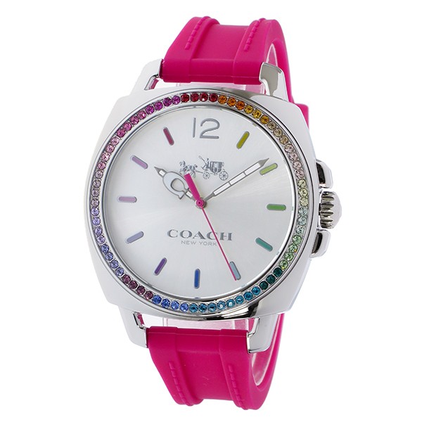 コーチ COACH ボーイフレンドスモール BOYFRIEND SMALL ラインストーンベゼル クオーツ レディース ウォッチ 時計 シルバー 人気ブランド  商品仕様:(約)H×W36×D10mm(ラグ、リューズは除く)、重さ(約)59g、腕周り最大(約)17.5cm、最小(約)13.5cm ステンレス(ケース)、シリコン(ベルト) 専用BOX、保証書