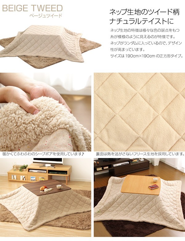 【商品について】ツイードこたつ布団×こたつテーブル2色から選べる!【カジュアルこたつ2点セット(正方形・70cm幅)】■サイズ:本体外寸:(約)幅70x奥行70x高さ35.5cm(約)11.74kg布団:(約)幅190x奥行190cm(約)3kg■カラー:Aセット、Bセット、Cセット、Dセット■素材:(こたつ本体)天板:パーチクルボード、PVCシート 脚:MDF、PVCシート※付属品:300Wヒーター(メトロ電気工業製)スイッチ付き電源コード(こたつ布団) キルティング製品表側:ポリエステル50%、アクリル30%、その他20%裏側:ポリエステル100%■その他:・完成品でお届けします。※脚はお客様取付け梱包サイズ:本体:(約)73.5x73x11cm布団:(約)55x45x25cm
