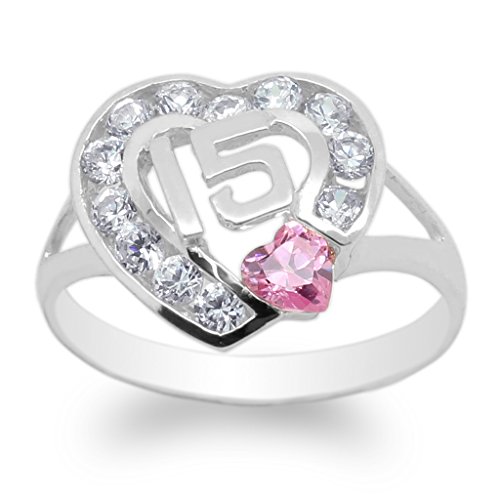 -. Title : JamesJenny Ladies White Gold Plated 15 Anos Quinceanera Pink Tourmaline Heart CZ Ring Size 4-10