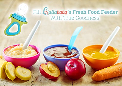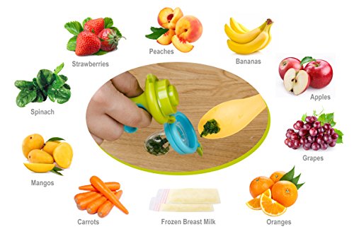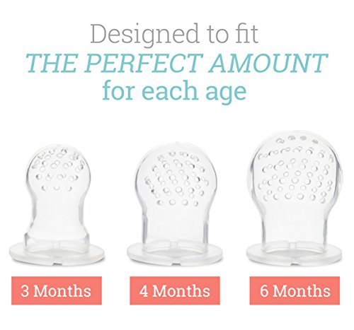 -. Feature : INTRODUCE NEW FOODS IN A SAFE AND HYGIENIC WAY: Easily introduce new foods to your baby without the risk of choking. Small holes allow your baby to get accustomed to new tastes safely while encouraging chewing. / RELIEVES IRRITABLE GUMS: Baby teething is such an uncomfortable time for any baby. Our fresh food feeder also becomes a great baby teether. Textured silicone surface is designed to be safe and comfortable for teethers to use. Using frozen fruits or ice helps to relieve pain while also helping to massage gums. Some innovative foods to introduce include frozen fruits, frozen yogurt or even frozen breast milk. / THE RIGHT SIZE FOR YOUR BABY: Each set comes with 3 different sized silicone sacs uniquely designed for 3 months, 4 months and 6 months of age. Each silicone sac is designed to fit the right amount of food and allow the tiniest food pieces that are safe for your baby. This also allows you to conveniently interchange the silicone pacifiers and insert more food as your baby grows. / CHILDPROOF & SAFE: Childproof snap lock opens & shuts easily while keeping your baby safe. Our products are free of any harmful chemicals and are certified to be Latex free, Lead free, BPA free, and Phthalate free. / EASY TO CLEAN: Unlike mesh food feeders, our silicone feeder is a breeze to clean. Wash with warm soapy water or boil to sterilize. Our product is guaranteed to last while your baby is still in diapers and beyond. If for any reason you are not satisfied with your purchase, please let us know and we will either replace the product or give a full refund.