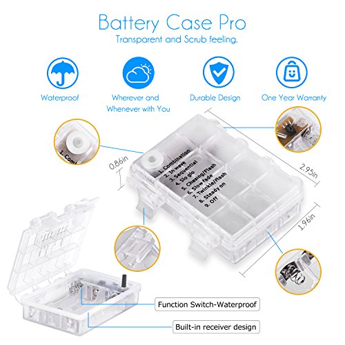 - Remote control and Timer: it has a battery box with a power button and it also comes with a remote control. This upgraded version with timing function, adjustable brightness, 8 lighting modes (Combination;In wave;Sequential; Slo glo;Chasing/Flash; Slow fade; Twinkle/Flash, etc) creates vibrant, dynamic atmospheres. 8 on the remote is the steady on light mode.