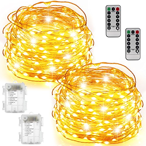 2 Set Fairy Lights Battery Operated Waterproof with Remote Control(Timer), Warmtaste 8 Modes 100 LED 33ft String Lights Copper Wire Firefly Lights for Bedroom Wedding Festival Decor