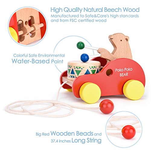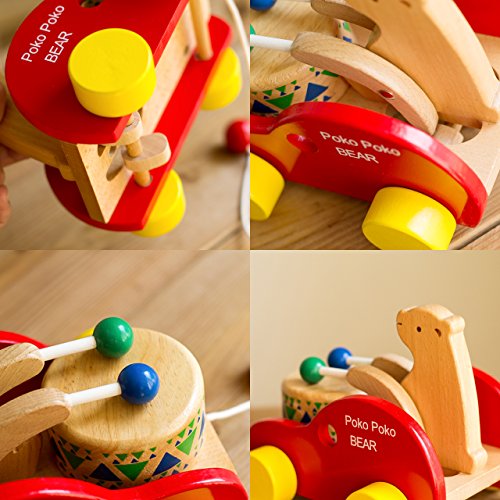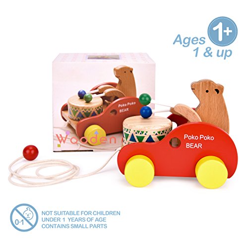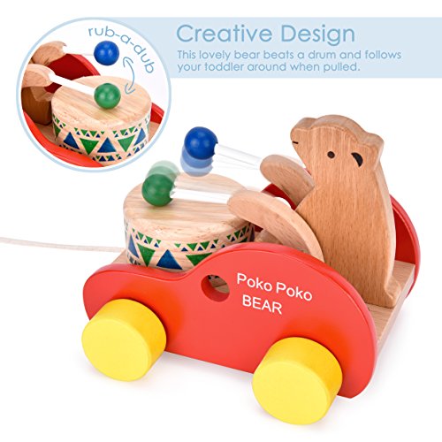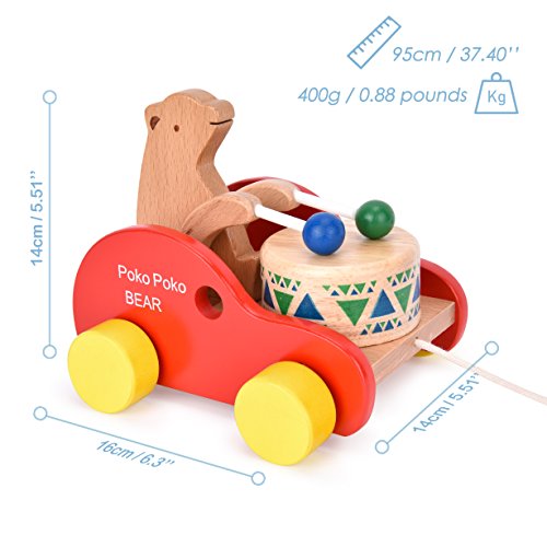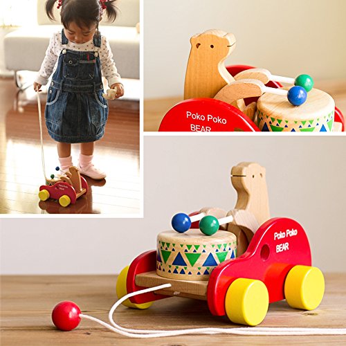 【LOVELY DESIGN TO HELP YOUR KIDS' DEVELOPMENT】 This lovely bear beats a drum and follows your toddler around when pulled. This high quality lovely toy will help your little toddlers develop balance, early walking and hand to eye co-ordination and fine motor skills. Hand painted in a funky, bright bear style, it has a string to pull the toy along on its wheels. You can teach your kids to take care of bear that would be an excellent introduction for having and caring a pet.