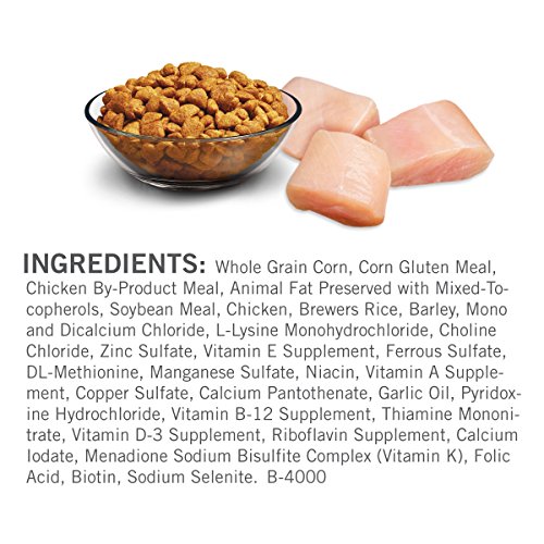 Whole Grain Corn, Corn Gluten Meal, Chicken By-Product Meal, Animal Fat Preserved with Mixed-Tocopherols, Soybean Meal, Chicken, Brewers Rice, Barley, Mono and Dicalcium Chloride, L-Lysine Monohydrochloride, Choline Chloride, Zinc Sulfate, Vitamin E Supplement, Ferrous Sulfate, DL-Methionine, Manganese Sulfate, Niacin, Vitamin A Supplement, Copper Sulfate, Calcium Pantothenate, Garlic Oil, Pyridoxine Hydrochloride, Vitamin B-12 Supplement, Thiamine Mononitrate, Vitamin D-3 Supplement, Riboflavin Supplement, Calcium Iodate, Menadione Sodium Bisulfite Complex (Vitamin K), Folic Acid, Biotin, Sodium Selenite. B-4000.