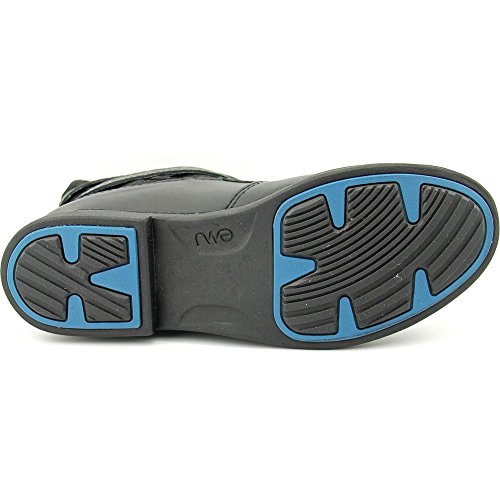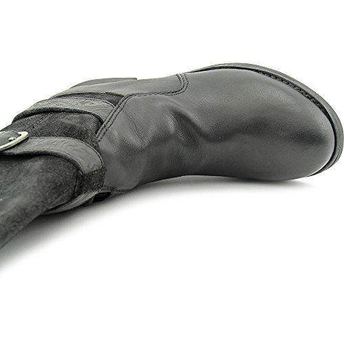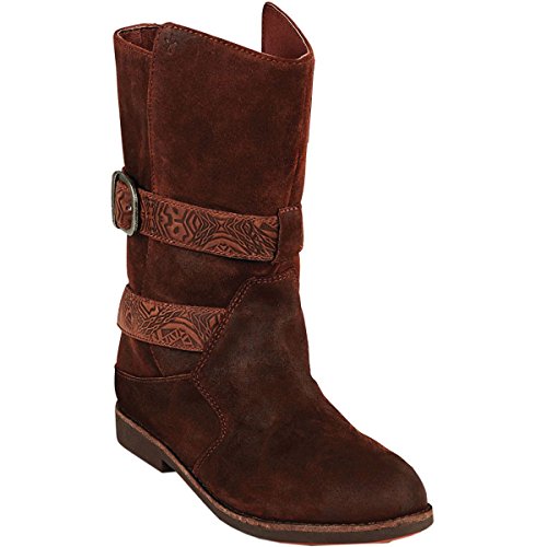 Relaxed pull-on boot features a split shaft, wraparound strap with adjustable buckle, distressed finish, rounded toe, non-slip sole