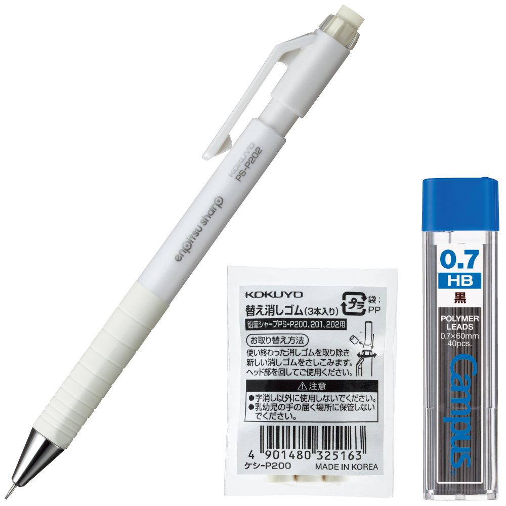 鉛筆シャープシリーズに、書き心地がさらによくなった鉛筆シャープTypeSが登場! 【カラー】 白 ※シャープペンシル本体にあらかじめHB芯が2本入っています。 【付属】 替芯(0.7mm・HB・40本入り)、替え消しゴム(φ7mm×23mm、3本入り) 【芯径】 0.7mm 【ペン寸法(軸径×長さ)】 φ10.5mm×143mm 【材質】 軸:PC、グリップ:TPE、クリップ:ABS 【芯先】 パイプスライド