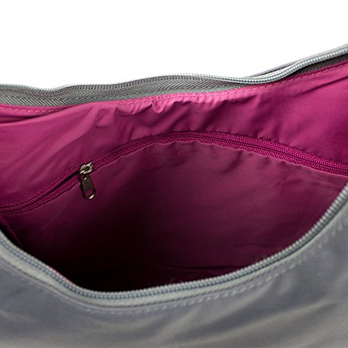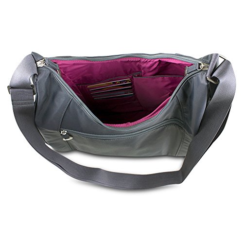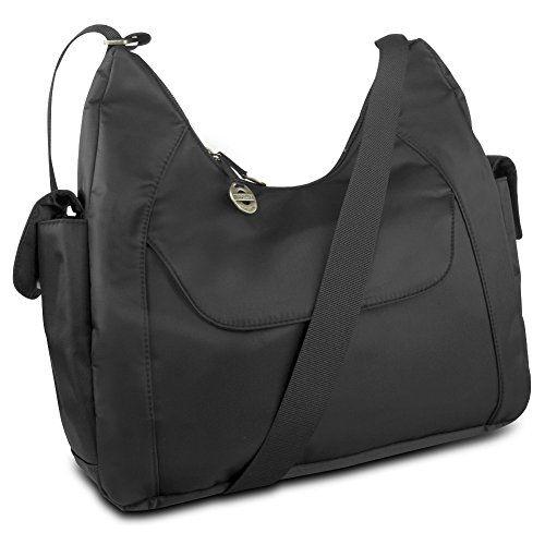 You always want to protect your identity everywhere you go so do it with the Travel on Oversized Everyday Hobo Style Bag w RFID Protection. Important documents such as your passport credit cards key cards and drivers license all contain RFID chips that broadcast your personal information. This bag blocks the transmission of this information preventing unauthorized access by others. It features a large main compartment with plenty of room for all your essentials plus 5 cards slots two slip pockets and interior zippered pocket for organization. Theres also two larger pockets on the front and back plus two side pockets for other odds and ends. The shoulder strap is easily adjustable so you can wear the bag as a shoulder bag or cross-body bag.Features. Perfect bag for all of your everyday needs even while traveling. Features RFID-blocking to keep your private information safe everywhere you go. Large main compartment has plenty of room for your essentials with 5 card slots two slip pockets and an interior zippered pocket. Includes rear zippered pocket and front magnetic pocket for odds and ends you need frequently. Two side pockets with snap closures provide the perfect places for sunglasses gum mints and more. Adjustable strap easily converts the bag from a shoulder bag to a cross-body bagIncludes. Hobo Bag. Detachable LED LightSpecifications. Exterior Color Gray-Hounds tooth. Interior Color Creamsicle Orange. Strap Drop Middle of Strap to Top of Bag Adjustable from 18 to 33 in.ApproxFeature