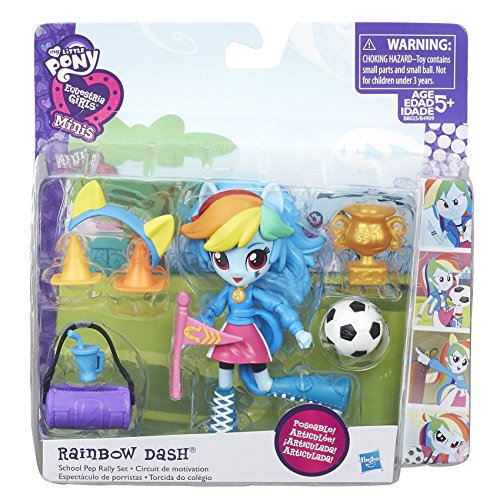Ready for the ultimate pep rally? It's time to show some school spirit with this My Little Pony Equestria Girls Minis Rainbow Dash School Pep Rally Set! Imagine watching an exciting soccer game with this fun, poseable Rainbow Dash mini-doll. Pretend she is running down the field to score the winning goal, or that she is saving the game as the best goalie ever! With10 included accessories, there are many fun and exciting scenarios to play out. Win or lose, Rainbow Dash deserves a high-five for her spirit hard work! My Little Pony, Equestria Girls and all related characters are trademarks of Hasbro.Feature