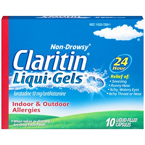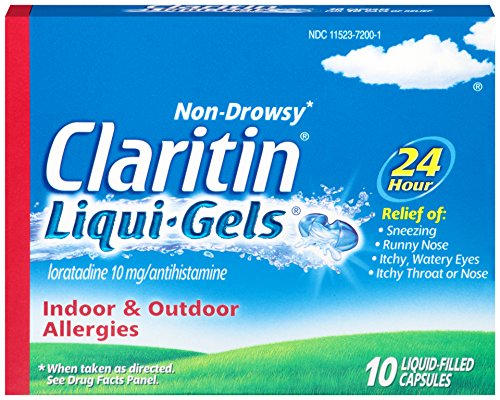 Claritin Liqui-Gels capsules provide powerful, 24 hour, non-drowsy relief of your worst indoor and outdoor allergy symptoms, including sneezing, runny nose, itchy/watery eyes, itchy throat/nose. Claritin provides relief of symptoms that can be triggered by over 200 different allergens. Claritin is an antihistamine, so it hinders the cascade triggered by allergens. For adults and children ages 6 . One capsule contains 10mg of loratadine. 0 |