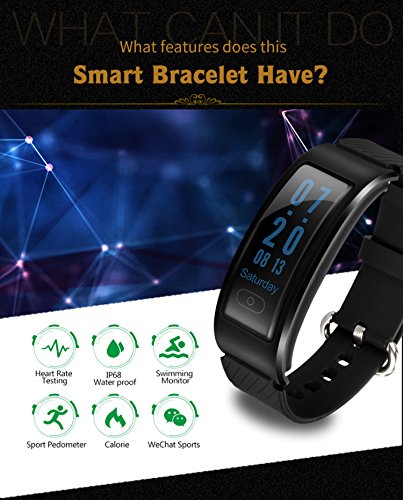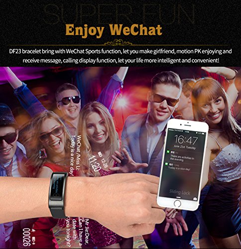 -. Feature : Variety function:This smart bracelet watch wristband will help keep your daily activity, training and sleep in balance for a healthier lifestyle. Help you monitor the daily sport condition. Heart Rate Testing,IP68 water proof,swimming Monitor,Sport Pedometer ,Calorie,Wechat sport,silent alarm,sleep reminder,Palming brighten screen,distance message alert,Call reminder / Comfortable and Wearable:perfect to fit your wrist with adjustable wristband, Light and durable, dust and water resistant protection. And it has sweatproof function, when you do some exercise you can enjoy it and do not need to worry about the sweat will damage your watch. / Exercise is to be cool:IP68 Grade Waterproof And Dustproof: DF23 smart bracelet waterproof level up to IP68 taking shower and swimming available. / Enjoy wechat : DF23 bracelet bring with Wechat sport function,let you make girlfriend,motion PK enjoying and receive message,calling display function, let your life more intelligent and convenient! / Data graph:After connect with the smart bracelet watch phone, total distance, total steps, total calories, Min heart rate, average heart rate, max heart rate, yesterday data and data summary will be shown on the App interface.