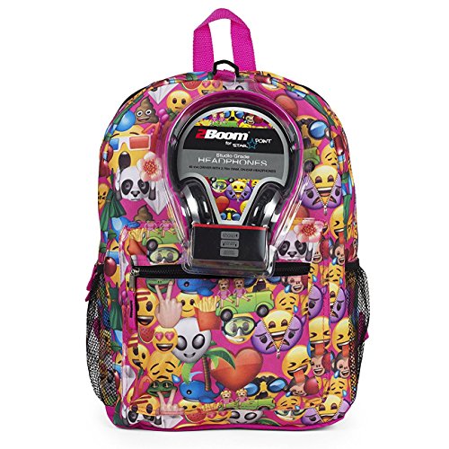 -. Feature : Includes backpack with 2 zippered compartments and 2Boom on-ear headphones / Emoji P.R.Int allover backpack / Side mesh pockets / Headphones are of modern design, high quality sound, and ultra soft ear grip / Hand wash backpack