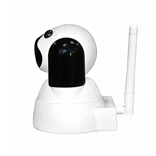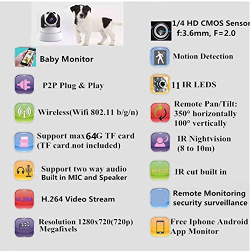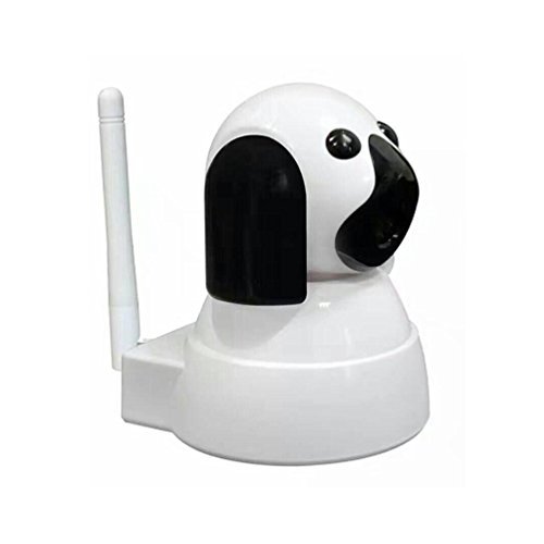 -. Feature : Cute Dog Style, New-designed IP Cam: 1/4" Megapixel CMOS Sensor, f=3.6mm F=2.0, 1280*720P resolution, Easy to setup WIFI, Support 2.4G WIFI (IEEE802.11b/g/n) and Wired Ethernet Cable, not support 5G / Remote Pan 350° Tilt 45°control camera with FREE app on your smart phone or PC; Built-in MIC and Speaker for two-way audio; / Loop recording, with micro SD Card Slot, max support 64GB(TF card not included. Can set Manual recording, Alarm recording or Scheduled recording; Easy to playback the video from mobile app and computer. / Smartphone App has four preset positions. Press the button 1, 2, 3 or 4 of APP, the camera will auto-rotate to be corresponding preset position; / Users can access the camera remotely via WIFI or 4G of android/IOS phone or computer anytime anywhere. It is widely used for home shop video monitor, Elderly Care and baby monitor.