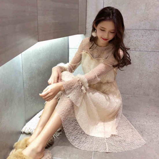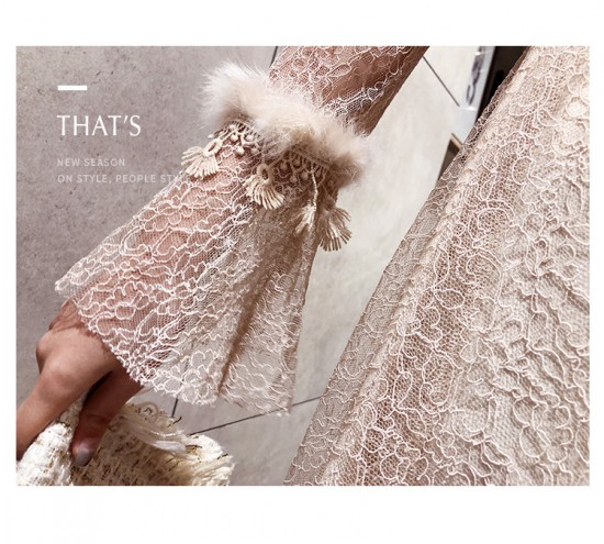 ワンピース パーティードレス セクシー レース ガーリー トレンド ベージュ ファー ひざ丈 可愛い drgz1801