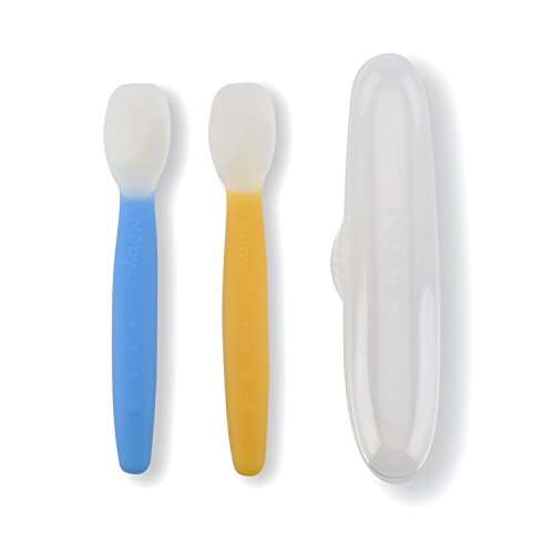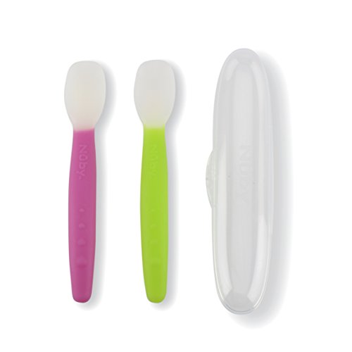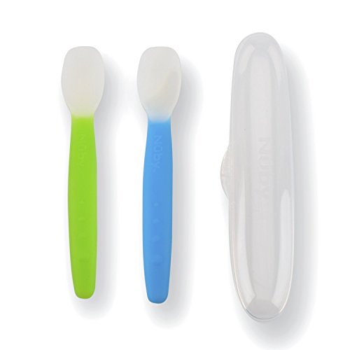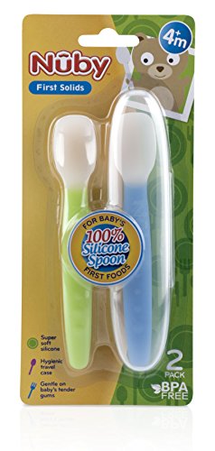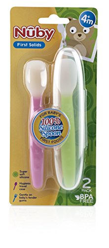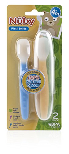 -. Binding : Baby Product -. Brand : Nuby -. Feature : SoftFlex 100% Silicone Weaning Spoon is soft and flexible; making it ideal for feeding your baby their first solid foods / The soft silicone is perfect on tender gums and new teeth / The SoftFlex spoon makes it easy to clean excess food from around baby's mouth and the deep bowl allows you to easily scoop the desired about of food for your baby / 4 months +/ Top rack dishwasher safe/ BPA FREE -. Label : Nuby -. Manufacturer : Nuby -. ProductGroup : Baby Product -. ProductTypeName : BABY_PRODUCT -. Publisher : Nuby -. Studio : Nuby -. Title : Nuby SoftFlex Silicone Spoon, 2 Count