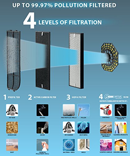 Ultra-quiet air purifier with 4 levels of filtration for cleaner, more breathable indoor air; for spaces up to 835 square feet;Pre-filter traps larger particles like dust and hair; active carbon filter traps odors, smoke, VOCs, and chemical pollutants;True HEPA filter captures 99.97% of particles and impurities as small as .3 microns, like pollen, dust mites, and virus bacterium;NanoCaptur filter permanently destroys formaldehyde, a common human carcinogen found in homes;Smart pollution sensors auto adjust filtration speed as needed; AHAM certified; Energy Star rated; 8-hour built-in timer