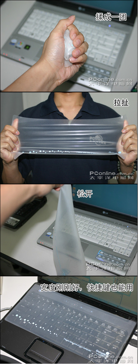 采用优质硅胶材料,精心设计和制作; 防水,再也不用担心水、可乐、果汁、咖啡等液体溅入键盘中而损害电脑; 防尘防脏,可避免灰尘、烟灰、饼干屑等掉入键盘中而影响键盘寿命;易清洗,保证您拥有一个崭新而又卫生的键盘;敲击键盘时不再像传统键盘那样会发出“噼哩啪啦”的响声,影响他人休息,可用于军事、实验室等要求高度安静的环境。