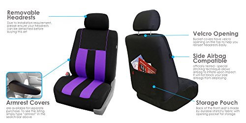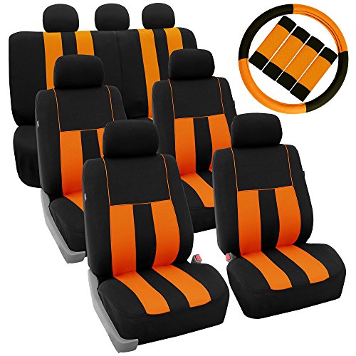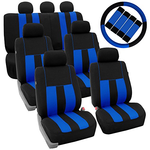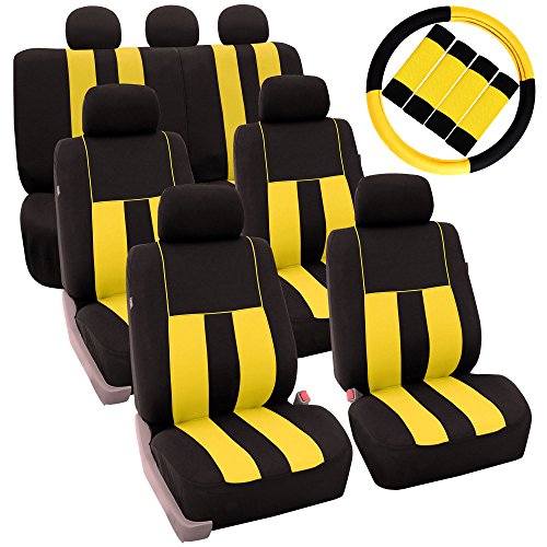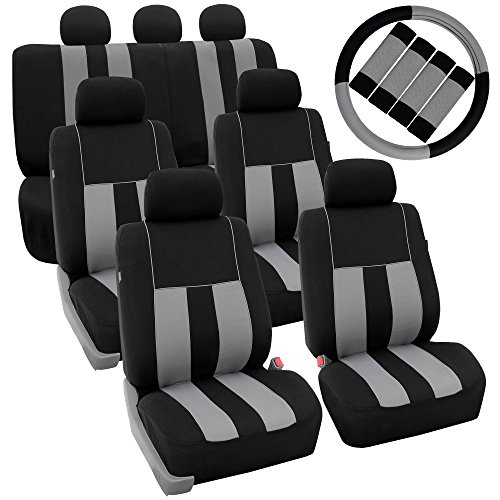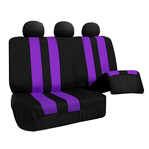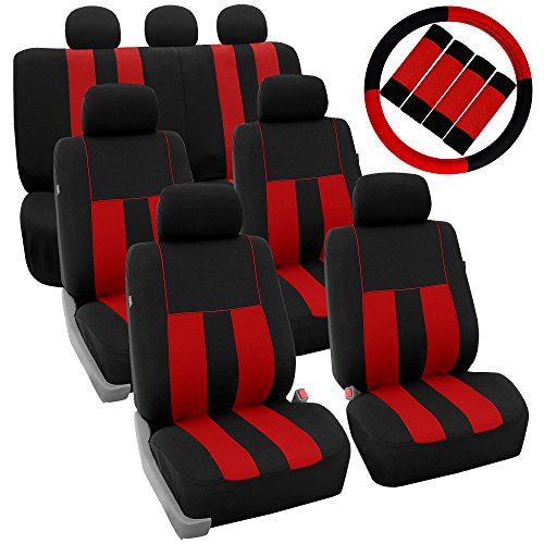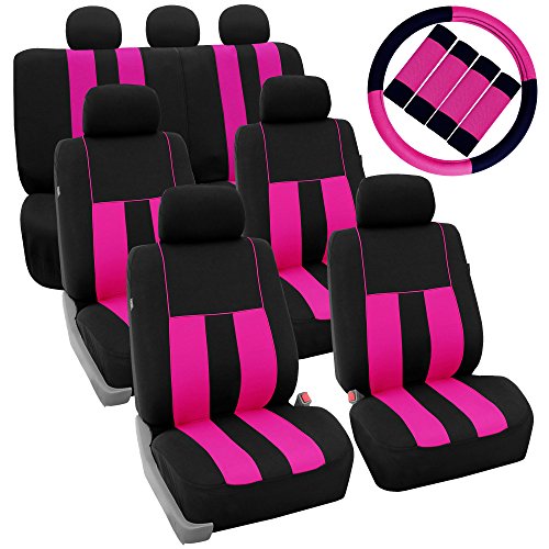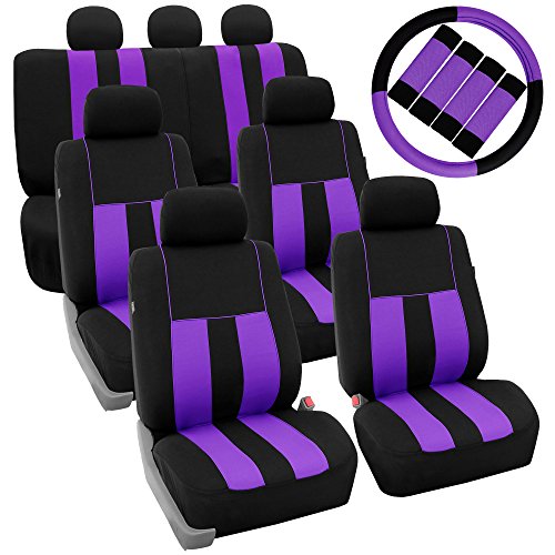 Ride in style with our boldest design yet. The eyecatching thick stripes of color are sure to catch attention. Comes in a variety of colors to match any interior. Our high quality fabric is backed by 3mm of foam padding to disperse heat and keep you cool and comfortable, even in the hottest temperatures. This full set includes seat and headrest covers four (4) bucket seats , one (1) rear split bench, 7 headrests covers and Steering Wheel Cover w. Seat Belt PadsFeature
