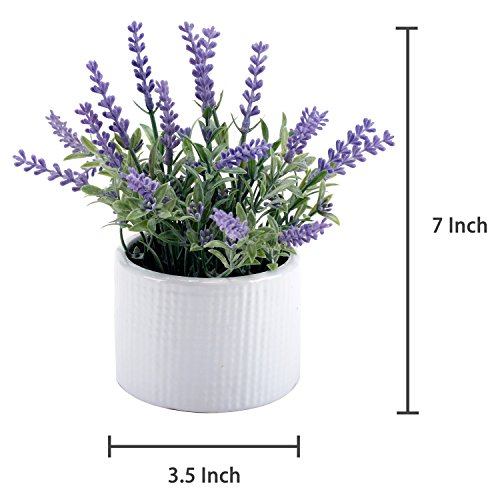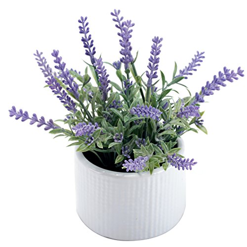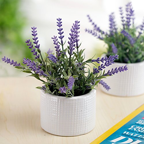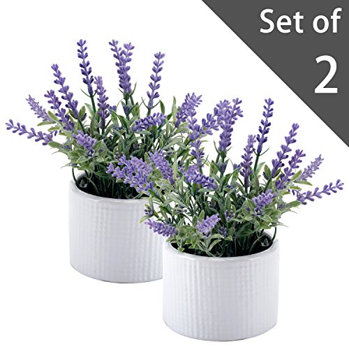 Small Artificial Lavender Plant, Faux Flowers in White Ceramic Ribbed Pot, Set of 2