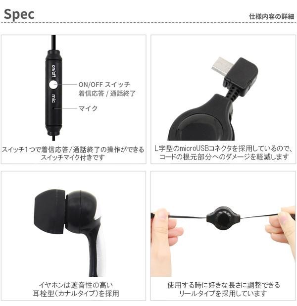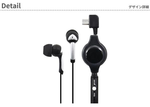 | スイッチ1つで着信応答・通話終了の操作ができるスイッチマイク付きイヤホン。L字型のmicroUSBコネクタを採用しているので、コードの根元部分へのダメージを軽減します。イヤホンは遮音性の高い耳栓型(カナルタイプ)で、好きな長さに調整できるリールタイプを採用しています。 |