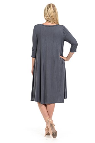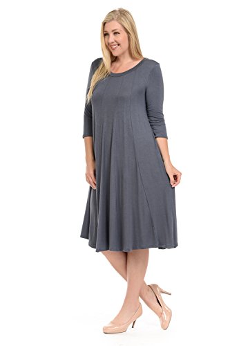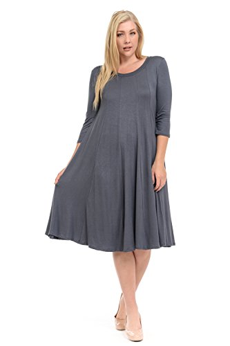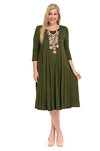 A-line plus size dress features a scoop neckline, 3/4 length sleeves, trapeze silhouette and midi length. This dress is made with knit jersey that is soft, drapes well and has great stretch.