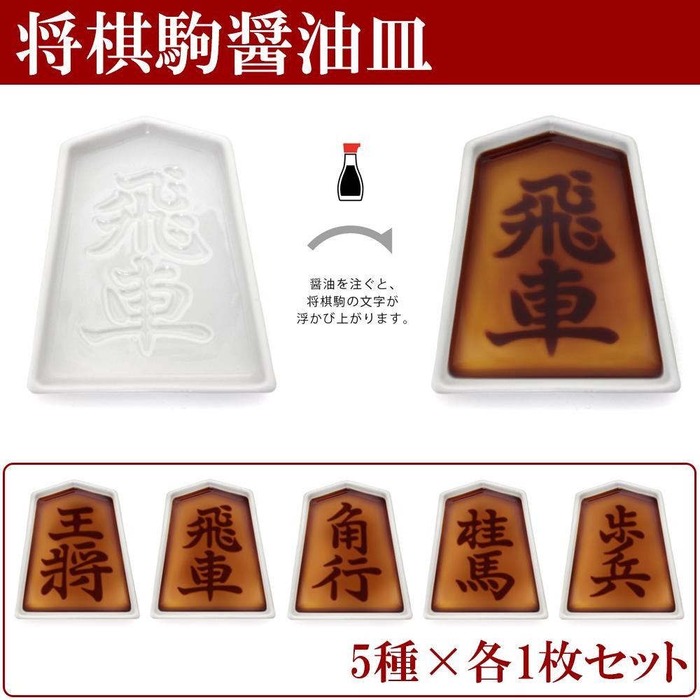 醤油を注ぐと、将棋駒の文字が浮かび上がる醤油皿です。お皿を裏返すと成り駒に!!「王将」「飛車」「角行」「桂馬」「歩兵」の5種各1枚ずつのセットです。 |