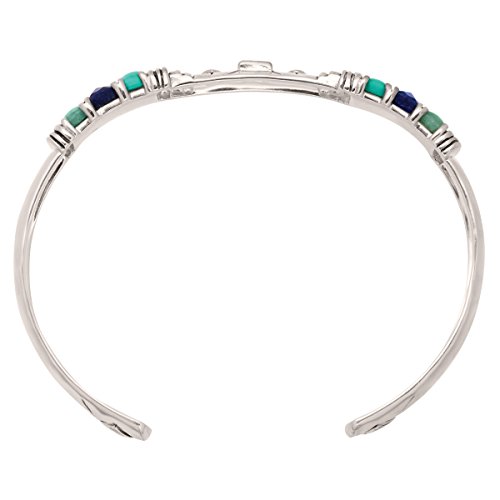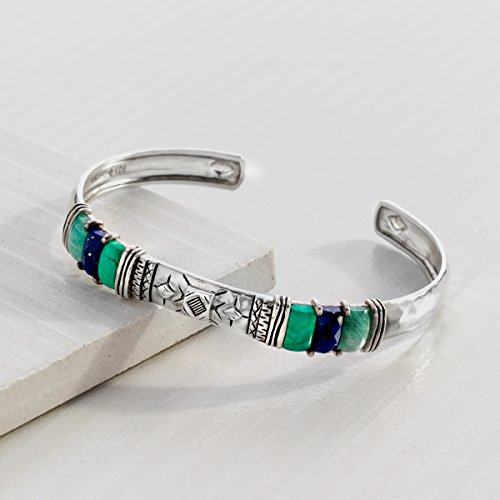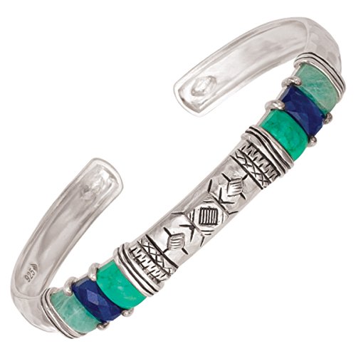 Allow the sterling silver Beach House Cuff to transport you to warmer days with sea-colored stones such as howlite, lapis-lazuli, and amazonite totaling 7 3/8 ct. Its design makes it easy to slide on and off while its cool colors make it ideal for wearing with a graphic top and white shorts. Bracelet measures 7 inches in circumference and 3/16 inches in width. Piece comes with a ".925" sterling silver stamp as a symbol of guaranteed product quality.