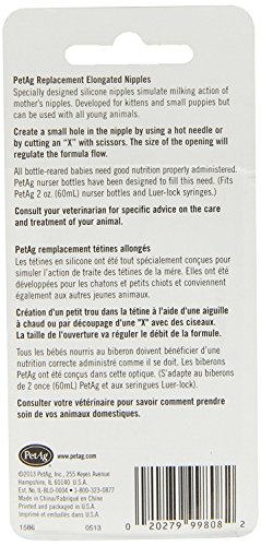 Studio : Pet Ag Inc Publisher : Pet Ag Inc Binding : Misc. Product Description Elongated Nipples are long, thin latex nipples designed for marsupials, various wildlife species and kittens. They may be used with the PetAg 2 oz nurser bottle or any volume luer-lock syringe. Replacement elongated nipples are available on a peggable card containing 5 nipples (3 Packages included). 15 Elongated Nipples Totals 0