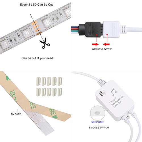 ➤CUTTABLE AND LINKABLE: light strips are easy to cut. Every 3 LEDs can be separated with scissors along the cutting marks without damaging the rest of the strip. NOTE: when connecting the control box with the lights, the arrows should be placed on the same line. Otherwise, the strip lights won't work