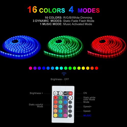 ➤MULTI-COLOR MODE: RGB LED strip lights support 16 colors looks like rainbow lights, 11 brightness levels and 3 dynamic modes: static, fade and flash, along with the music mode. The controller allows users to easily adjust light brightness or choose modes and colors for different events
