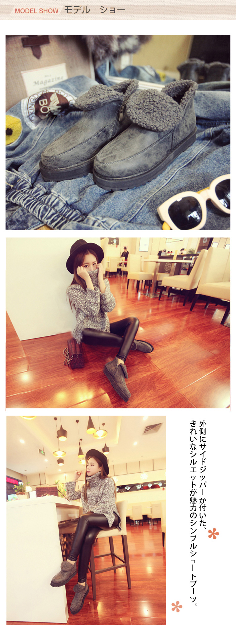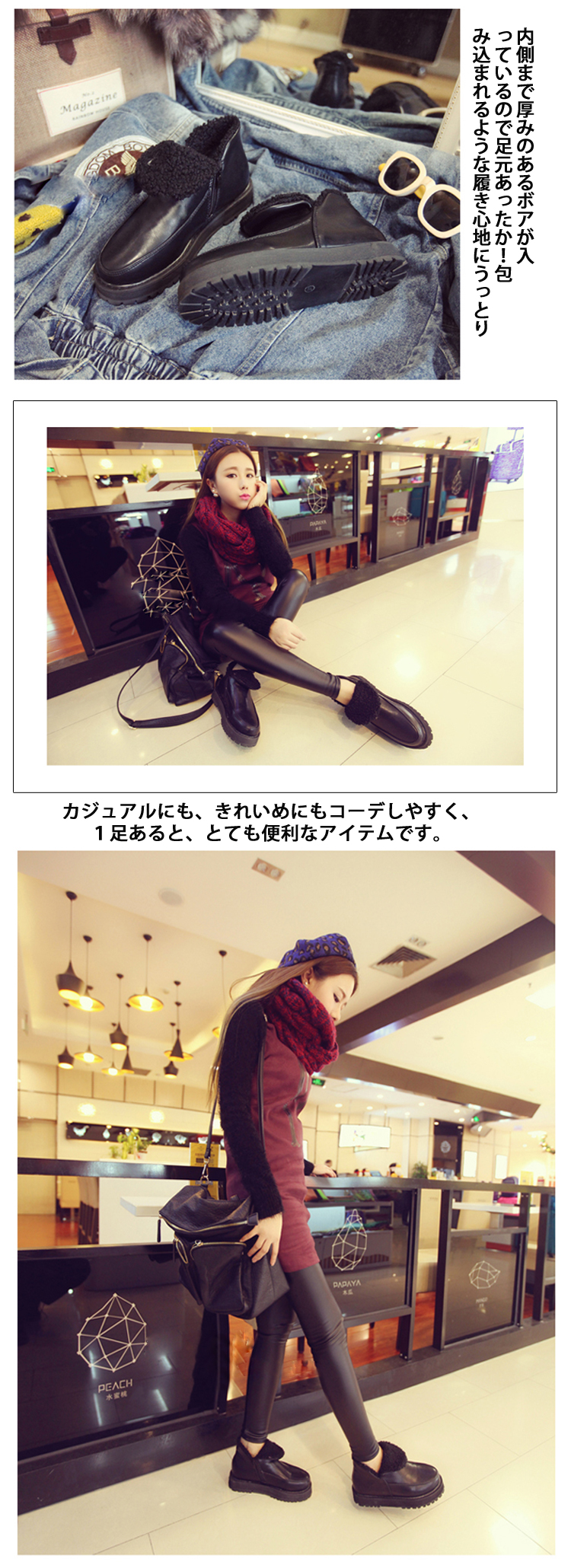 | プチプラながらもこだわった機能性と履き心地は必見!外側にサイドジッパーが付いた、きれいなシルエットが魅力のシンプルショートブーツ。カジュアルにも、きれいめにもコーデしやすく、1足あると、とても便利なアイテムです。ふわっふわのボアに注目!内側まで厚みのあるボアが入っているので足元あったか!包み込まれるような履き心地にうっとりサイドジップで脱ぎ履きしやすく、太めのヒールで安定感があり、歩きやすい底面は、ゴム底を使用しているので滑りにくい仕様となっています。 | |