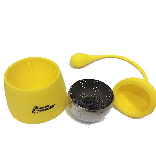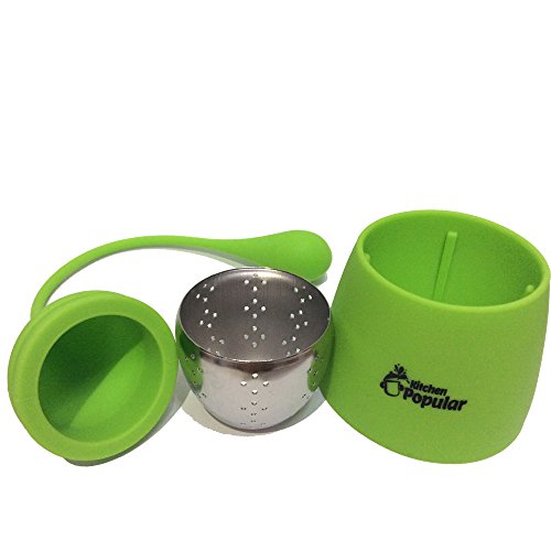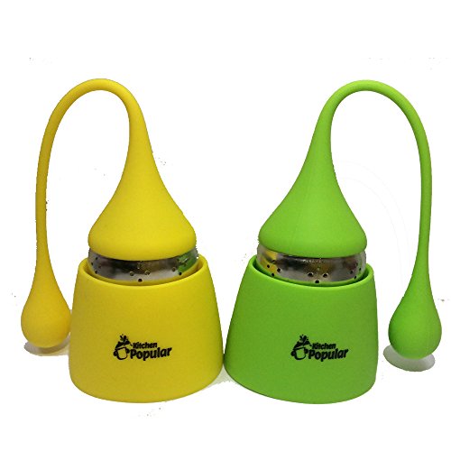 PREMIUM SILICONE TEA INFUSER - SET OF 2 WATER DROP TEA STRAINERS - SILICONE HANDLE & DRIP TRAY STAINLESS STEEL STRAINER - LOOSE TEA STEEPER - BEST FOR LOOSE LEAF OR HERBAL TEA - BY KITCHEN POPULAR