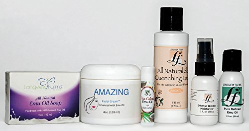 Give this to the special woman in your life (or to yourself)! This Pack is the ultimate in skin care -- show them you care! Contains: 1 Amazing Facial Cream, 1 All Natural Lotion, 1 Unscented Emu Oil Soap, 1 Intense Wrinkle Moisturizer, 1 Lip Refresher, & a 1 oz. Emu Oil. Buy one for everyone on your shopping list -- they'll love you for it! SAVE!