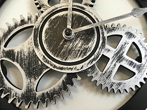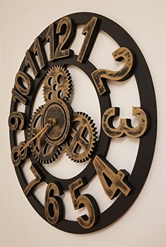 -. Title : 16" Round Wall Clock, Antique Handmade Wooden Vintage 3D Gear Design, By Chevy K.