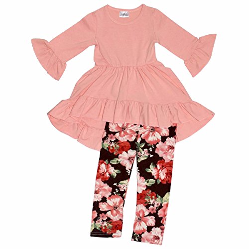 A versatile piece that is in style year-round, this is the perfect addition to your little girl's wardrobe! Floral prints make this one ideal in the last days of winter; through the duration of spring; and the entirety of summer. Dull pastel colors even make this a good wear during Fall! This set features a floral pattern on the leggings with a perfectly matching long sleeve skirt top and scarf. The pink ruffled tunic top completes the look. Made of a 97% high quality soft cotton and 3% stretchy spandex blend this outfit is SOOOO soft and comfortable!
