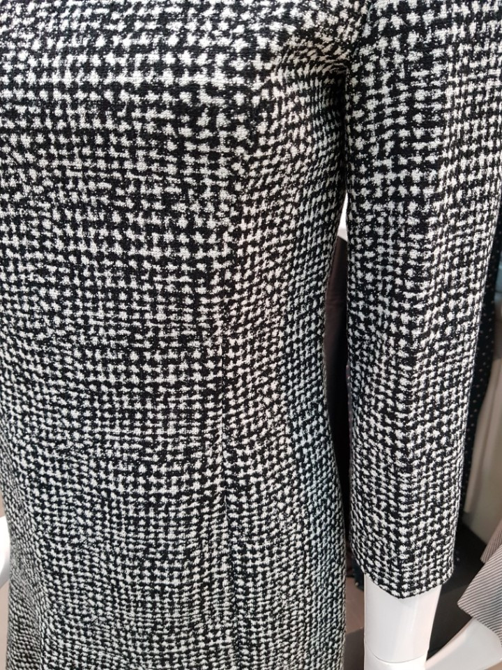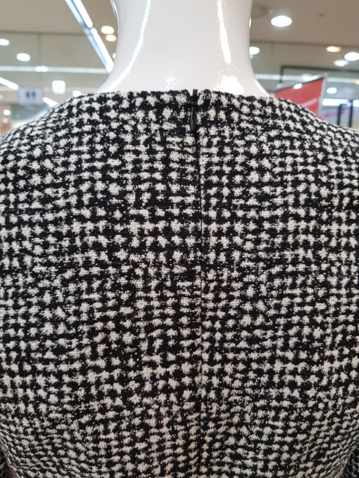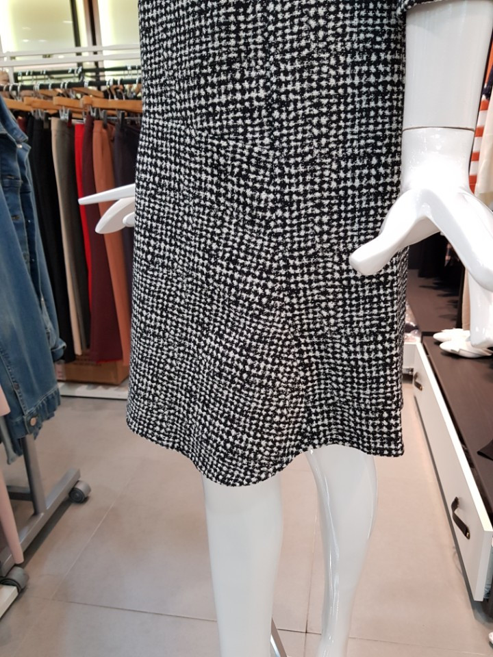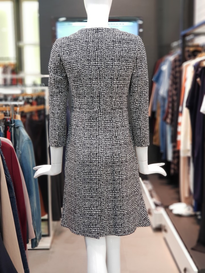 자카트 패턴이 울 오버된 원단으로 플라운스 헴라인이 페미닌한 원피스입니다