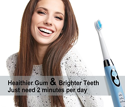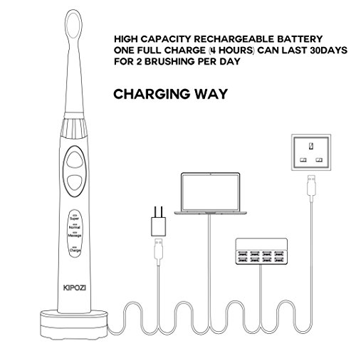 High Capacity Rechargeable Battery- One full charge via USB outlet with 4 hours can last 30 days for twice brushing per day, with low battery reminding.Smart timer encourages 2 minutes with a reminder every 30 seconds of brushing as recommended by dentists
