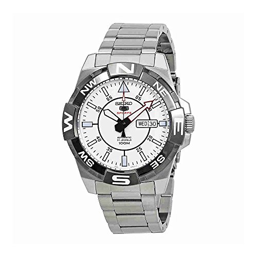 Stainless steel case with a stainless steel bracelet. Uni-directional rotating gunmetal ion-plated bezel showing compass markings. White dial with luminous gold-tone hands and index hour markers. Minute markers around the outer rim. Dial Type: Analog. Luminescent hands and markers. Day of the week and date display at the 3 o'clock position. Seiko caliber 4R36 automatic movement with a 41-hour power reserve. Scratch resistant mineral crystal. Transparent case back. Case size: 46 mm. Case thickness: 13 mm. Round case shape. Band width: 22 mm. Deployment clasp. Water resistant at 100 meters / 330 feet. Functions: date, day, hour, minute, second. Sport watch style. Seiko 5 Automatic White Dial Ladies Watch SRPA63.
